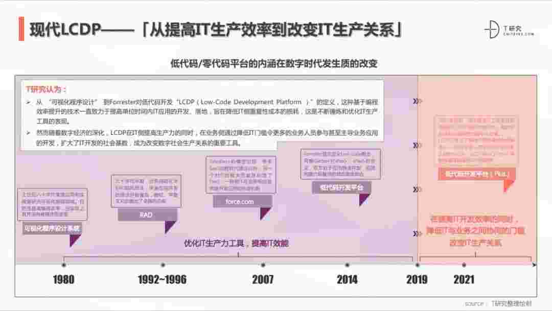 2020年前后,,,,,,,源于提高IT工作者开发效能的LCDP不断进化和衍生,,,,,,,,,,面对业务导向日益明显的数字化变革。。。。。。。。LCDP衍生出了面向不同对象的升级服务——面向专业人群的LCDP和业务人群的NCDP,,,,,,,LCDP与NCDP的不同服务属性被逐渐认可和接受。。。。。。。。。。。。。 LCDP在提高IT开发效率的同时,,,,,,,,,降低IT与业务之间协同的门槛改变IT生产关系。。。。。。